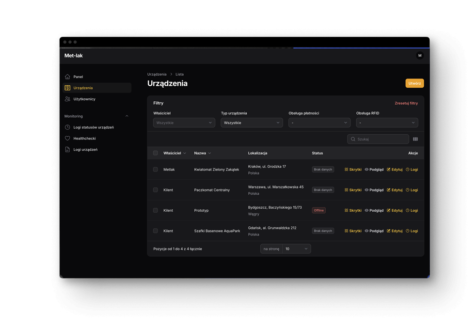 Met-Lak to rodzina inteligentnych szaf depozytowych w kilku wersjach konstrukcyjnych, z oprogramowaniem: portal WWW dla odbiorcy końcowego (pobrania, odbiory, stany) oraz panel realizacyjno‑serwisowy dla Zamawiającego/operatora – parametry, harmonogram, monitoring i obsługa serwisowa zdalna.
