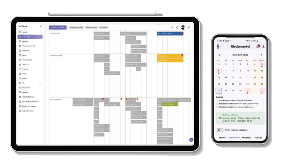 Tindesk to platforma do planowania prac i zarządzania zespołami serwisowymi: zlecenia, technicy, stany pracy i zasoby w jednym obiegu. Aplikacja mobilna Flutter wspiera pracę w terenie (statusy, checklisty, zdjęcia), a warstwa WWW to koordynacja, raporty i spójność z biurem.